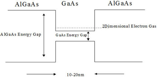 For example, a Quantum Well (QW) is built by inserting a very thin GaAs or InGaAs films between two slightly thicker, larger band gap semiconductors (such as AlGaAs or InAlAs) giving rise to the Quantum Well concept (see Figure 1). This QW is then able to "trap" electrons which are then called a 2 Dimensional Electron Gas (2DEG), so called because they are trapped within the QW plane, in effect confining them to 2 dimensions instead of being free to "roam" the semiconductor crystal in 3D as is the case for conventional Hall effect sensors.